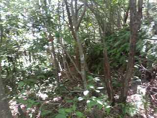 尾根伝いに西方の山守砦を目指す。途中に切岸と土塁があった。 | 山守砦手前の段々の平場群。 |