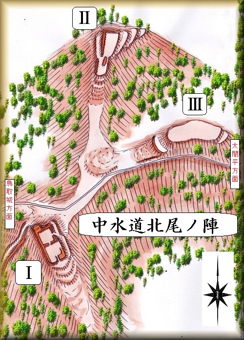 鳥取城の支城群から離れた北側の山稜に築かれている。上記の書の図面を見てみるとなかなか充実した遺構を残す陣城であるようだ。