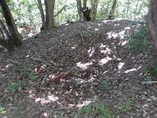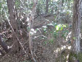 上の駐車場から城のある尾根までは比高20m未満である。というわけで斜面に入り込んで行く。するとすぐに腰曲輪状の平場があり、それに面した尾根の北側斜面は、しっかり削られた切岸面となっているのが分かった。