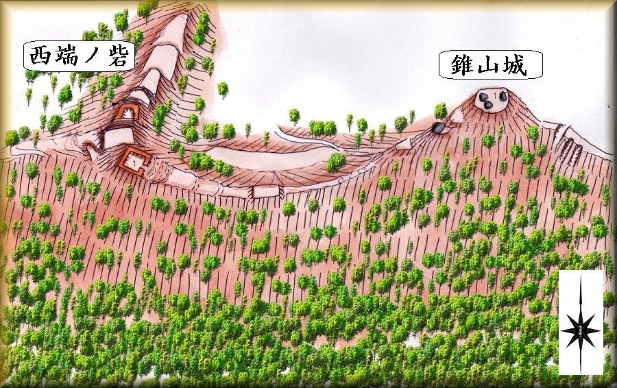 西端ノ砦の場所。 錐山城の場所。