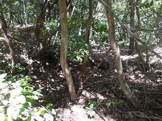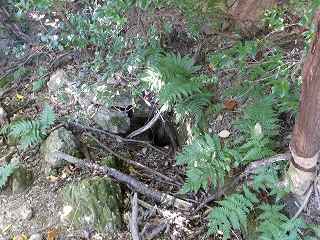 どうやらイノシシの巣穴があったらしい。巣穴にいたイノシシが、私の接近に気づいて慌てて逃げだしていったようだ。今回はこちらに向かってこなかったので助かったのだが、イノシシの巣があるので、ここを訪れる人は注意した方がよいと思う。