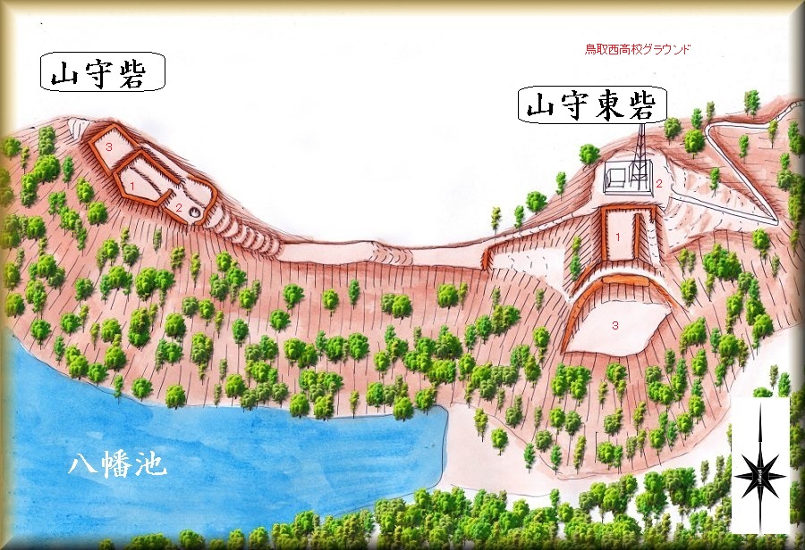 山守砦と山守東砦は、八幡池の北側の山稜に築かれており、鳥取城から西方に延びる尾根の先端近い部分にある。