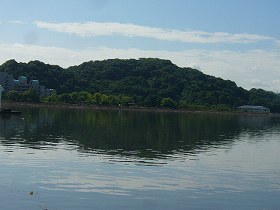 北側から中海越しに見た米子城。比高60mほどの独立した湊山の上にある。湊山というだけあって、ふもとには湊があったのだろう。 | 北西側山麓の駐車場の手前にある裏御門の枡形の跡。 |