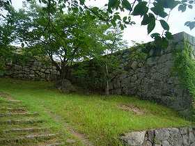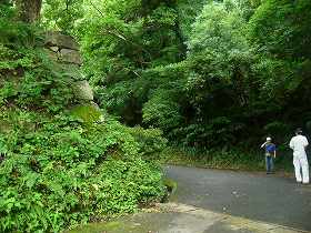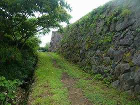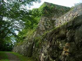 本丸の西側下の通路。この左下も石垣になっている。 | 真下から見る天守台。非常に大きい。ここに天守が建っている勇姿を見てみたいものだ。 |
