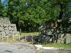二之丸テニスコートの東側下には、大手の枡形門跡が現在も残っている。方30mほどの大きな枡形で、かつては周囲に多聞櫓が建っていたのだと思われる。この桝形門から上がっていった所には、旧小原家の長屋門が移築されている。また、この桝形門の上の櫓台跡と思われる辺りに、長方形に地面が窪んだ区画が2箇所あった。火薬庫か何かの跡のようにも見えるが、実際は何だったのであろう。
