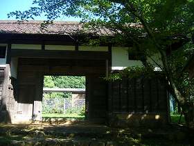 東側に残る大手枡形の入口。 | 枡形を上がっていった所には、旧小原家の長屋門が移築されている。 |