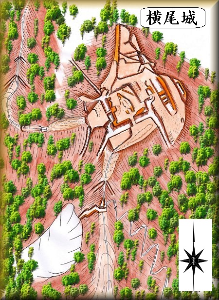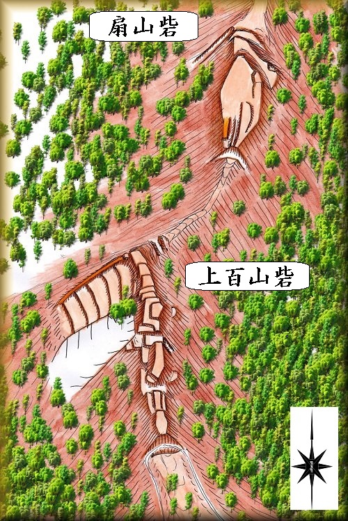 横尾城に登って行く途中の尾根の分岐点の北側には上百山砦が、さらに尾根続きに北側に行った所には扇山砦がある。