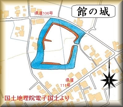 館の城は栄顔寺の北方200mほどの水田地帯に存在していた。現在では遺構は消滅してしまっている。「館」という字名があったところで、地籍図では50m×80mほどの長方形に近い区画が確認できる。
