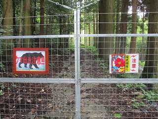 進んで行くと「熊注意」の看板と共に獣除けの柵があった。それを開けて、荒れた林道を登って行く。・・・・ところが、道は途中で行き止まりになってしまっており、城址の方へは行けなくなっていた。