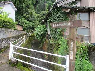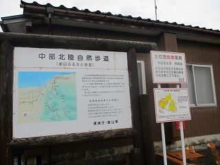 横尾城と中部北陸自然歩道の案内は山麓の上横尾公民館のところにあり、中部北陸自然歩道入口はこの場所である。車は上横尾公民館に停めさせてもらうとよい。