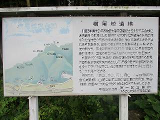 | 上横尾公民館にある中部北陸自然歩道の案内板。 | 道路を挟んだ反対側に横尾城の案内板が設置されている。 |
