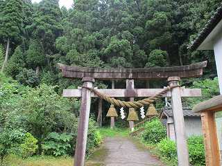 | 東方から遠望する飯久保城。ここからの比高は90mほど。 | 八幡神社の鳥居。ここをくぐって行く。 |
