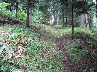 | 2郭下の横堀。雨で笹薮が濡れているが、頑張って突破! | 1郭の城塁。 |