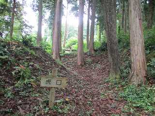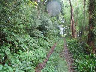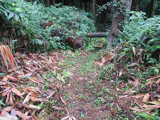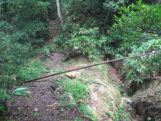 | 入口表示があるので、このまま真っすぐ進んで行く。道は途中で左に折れ橋を渡って東側の尾根に取り付くようになる。 | 4郭側面部の登城道。右側は段々の地形になっている。 |