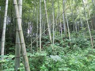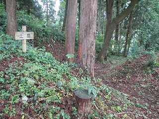 そこから右手の城址方向の斜面に登ってみる。途中までは道が付けられていたのだが、すぐに道はなくなってしまい、ヤブ漕ぎ直登状態になってしまう。頑張ってヤブの中を進んで1郭近くまでは行ったのだが、雨のためにヤブは濡れており、途中断念することになってしまった。