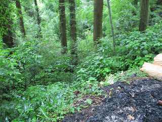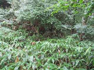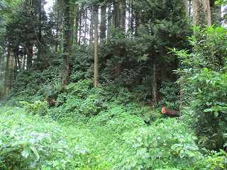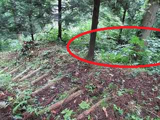 | 背後の堀切の表示があるが、ヤブがひどくてまったく分からない。 | 3郭下の堀切跡と思われる箇所。 |