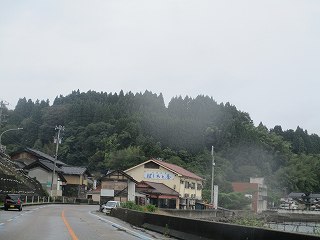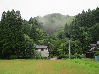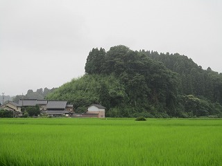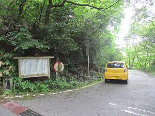 東側から城址に近づいて行くと、城内に上がって行く林道が付けられているのが分かる。雨が降っていなければ、車で上がれそうな道であるが、結構急なので路面が濡れている時にはスリップしそうなので避けた方がよさそうである。この日は雨だったので、車はどこか道路の余白を探して停めて置くことにした。