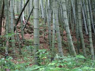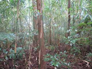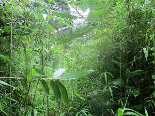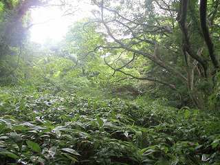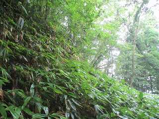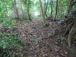 比較的平坦な尾根をどんどん進んで行くと、次第に尾根は急傾斜となっている。急斜面には、かつてはロープが張ってあったようなのだが、現在では大部分が切れて地面に落ちてしまっている。仕方がないので片手に傘を差し、片手でその辺りの木の枝を掴みながら登って行く。