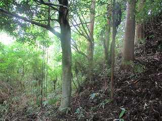 1郭からは南西側にも尾根が続いており、こちらにも3本の堀切が残されているようなのだが、現在のヤブでは夏場に探索するのはかなり困難な状態である。