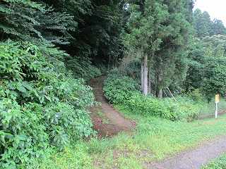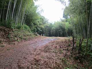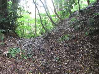 | 東側に降って行った所に山道が付けられているのを発見。ここから登って行く。路肩に余裕があるので車も停めて置ける。 | 5郭前面の城塁。 |