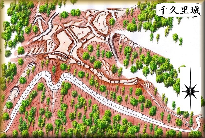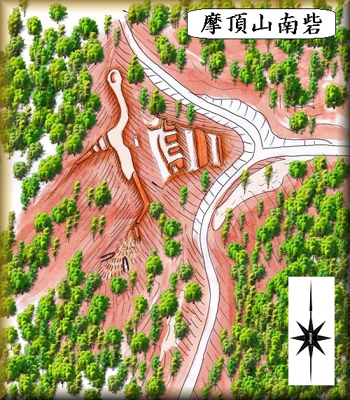 そういうわけで、2郭より先の細部については確認できていない.。右の鳥瞰図は上記の書の図に頼り切ったものである。