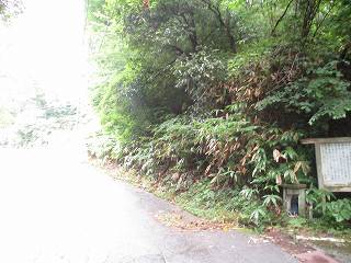 | 摩頂山城への入口。道路幅が広いので車を停めて置くことができる。 | 途中に見えてくる墓地のある平場。 |