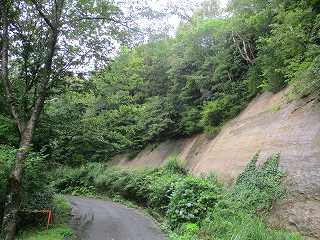 このカーブの所から城塁をよじ登って行けば、すぐに堀切に到達できるはず、と思ったのだが、道路近くの斜面は削られたようになっていて登りにくい。普段なら頑張れば登れそうな斜面だが、何しろこの日は雨である。雨の降る中、傘を差して登れるような場所ではなかった。