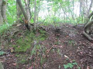 ここから2,3,4と堀で区画された中心となる郭が3つ配置されているのだが、この辺りは笹薮で埋もれている。平素ならばかき分けながら通って行けばよい所なのであるが、土砂降りの中、この笹薮を通っていったら、ずぶ濡れである。仕方なく、ここから先へ行くことはあきらめた。