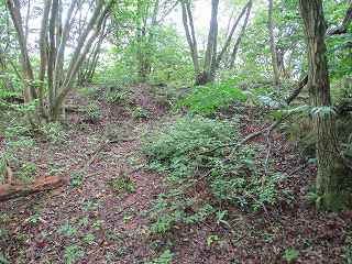 | 5郭内部。土塁が配置されている。 | その先にある堀切状地形。 |
