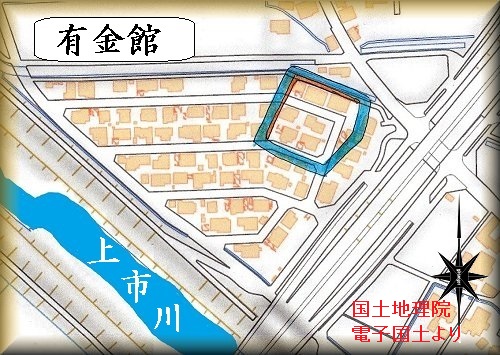 有金館は上市川の北岸、有金の住宅地の北側部分にあった。昭和26年に耕地整理が行われたうえ、現在では住宅が建て込んでしまっているため、遺構は完全湮滅してしまった。