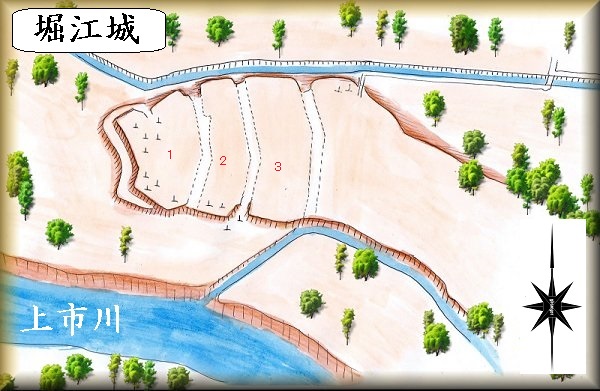堀江の中加積神社の南東にある比高6mほどの低い台地が堀江城の跡である。南側は上市川に臨む河岸段丘となっている。