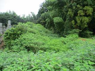 | 土橋脇の堀。 | 土塁上にまで墓地が造成されている。 |