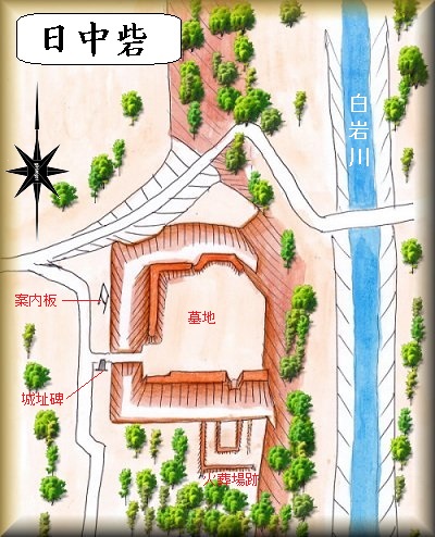 立山町日中の集落のある台地の東端にある墓地が日中砦の跡であり、googlemapにも掲載されている。