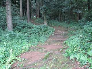 | 1郭手前の城塁。 | 神社西側の石段。かなり急で崩れかけており、上り下りは危険である。 |