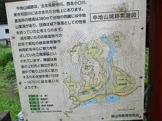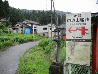 県道67号線から中地山集落への道を登って行くと、北陸電力の中地山発電所の水路を過ぎたあたりに公民館があり、その脇に中地山城の案内が立てられているのが目に入ってくる。公民館に車を停めさせていただき、案内表示に従って進んで行く。