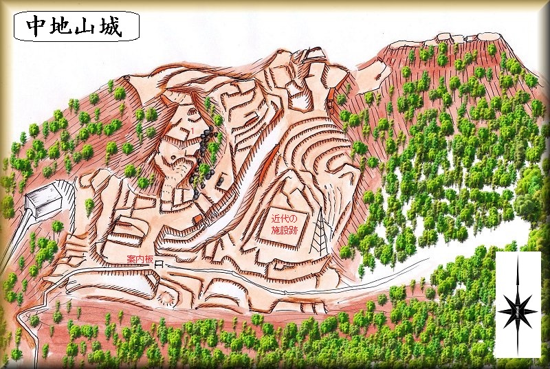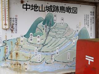 その先にも「←中地山城入口」といった表示があるので、それに従って進んで行けば、迷うことなく城のある山中に入り込んで行くことになる。途中の民家の壁面には、中地山城の鳥瞰図が描かれたものが貼り付けられている。個人で設置したものなのであろうか。