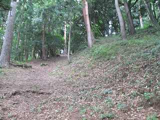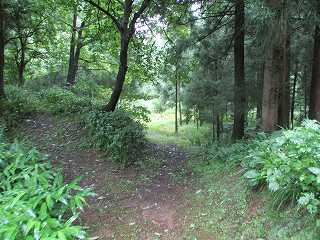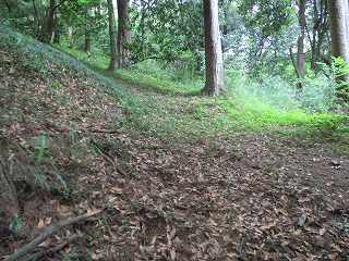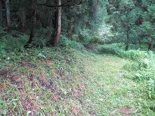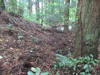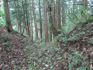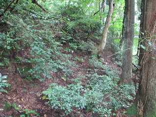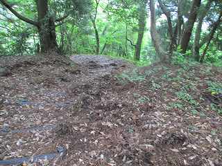 さらに東に行くと地勢が下ったところが堀底状になっている。その先の郭の先端の切岸の所から、この堀底状になっているところに側面部から通じるようになっている。これが本来の登城道であった可能性がある。城域は東先端の切岸の所で終わっている。