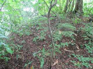 さらに緩やかな斜面を進んで行くと3郭の城塁が見えてきた。内部はやはりヤブだが背後に土塁が盛られているのが見えてくる。高さ2m未満で、土塁の規模は大きくない。