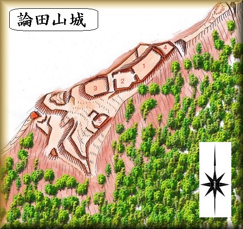 富山市亀谷地区の北側にそびえる比高130mほどの山稜が論田山城の跡であり、googlemapにも掲載されている。南側から見ると、整った形の、高く見える独立山稜である。