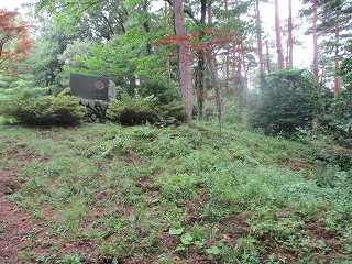 そこから東側に進んで行った所に碑が建てられている。この辺りが主郭ということになるだろうか。そこから東側には中央部を土橋状に削り残した堀切がある。ヤブになっているので分かりにくいが側面部はしっかりとした堀になっているのが分かる。