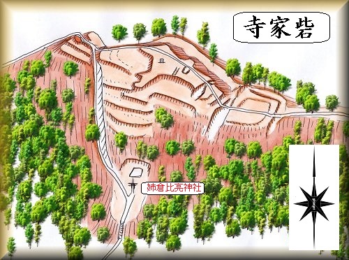 寺家公園の北側の姉倉比亮神社の背後にそびえる比高40mほどの山稜が寺家砦の跡であり、googlemapにも掲載されている。