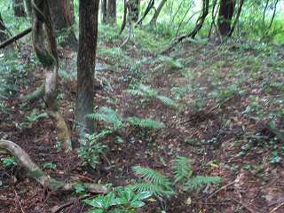 | 山頂に向かう山道。右手の斜面上には段々の削平地がある。 | 山稜西側の虎口状部分。 |