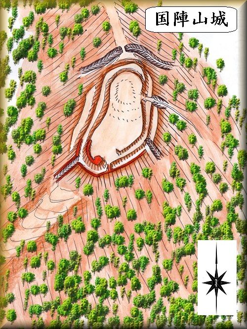 国陣山城は山頂部分を削平して築かれたもので、側面部を切岸加工することで帯曲輪と一部横堀を形成しただけの簡素なもののようである。