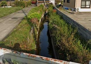 現在も北側から東側を通っている水路がかつての堀の名残を示していると思われる。