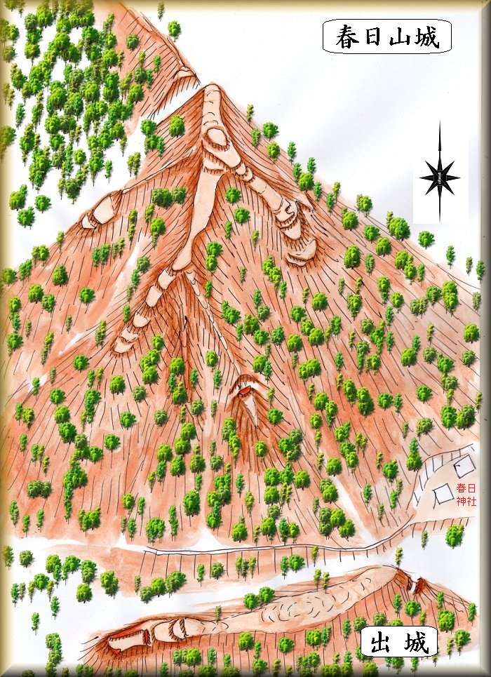 西三谷にある春日神社の背後の比高110mほどの山稜が春日山城の跡である。