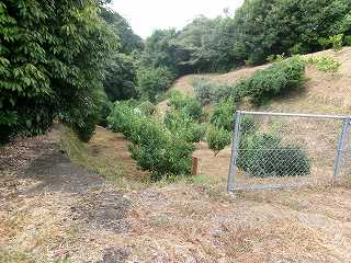 西岡城は、住宅地のある台地から南端に進んだ柿畑の中に位置している。