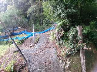 帰宅後に調べてみたところによると、登城口はこの辺りにあったらしい。ところが、それをよく調べておらず、林道が途中で下りになってしまったので、てっきり行き過ぎたのかと思って、途中の梅畑の所から取り付いて行くことにした。本来の登城口を探すには、林道を降ってさらに歩いて行くものと思っていた方がよい。