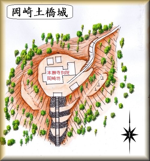 和歌山市森小手穂にある本願寺別院岡崎坊が、岡崎土橋城の跡であるという。