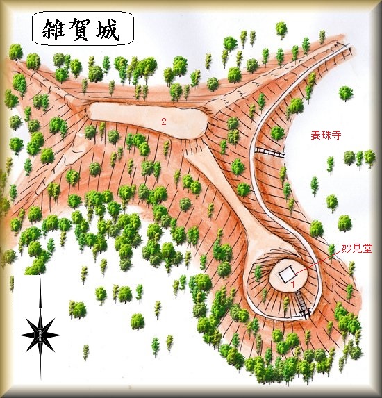 雑賀城は養珠寺の西側にそびえている比高30mほどの独立山稜に築かれていた。