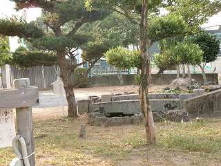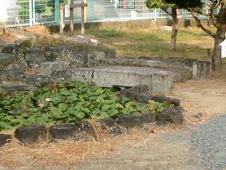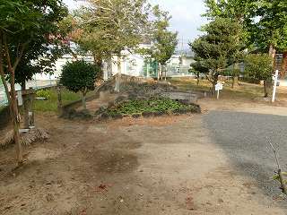 小学校の敷地内に池があり、そこに石橋が架かっているのだが、あるいはこれが遺構と関連しているものなのかもしれない。